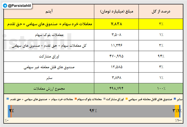 همانطور که در جدول فوق مشاهده می نمایید ارزش کل معاملات امروز بازار 498,794 میلیارد تومان بوده که از این مبلغ 7,838 میلیارد تومان آن مربوط به معاملات خرد سهام و حق تقدم و صندوق های سهامی بوده است.