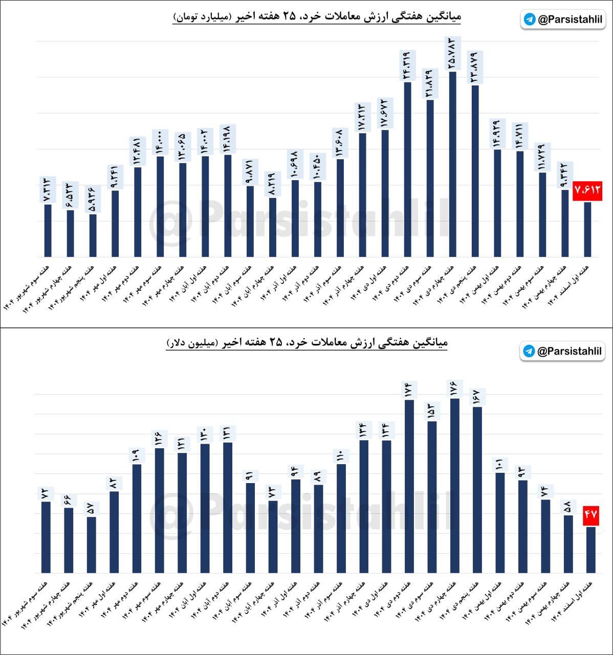 میانگین هفتگی معاملات خرد (ارزش معاملات دلاری) هفته اول اسفند 1404 به 47 میلیون دلار رسید.