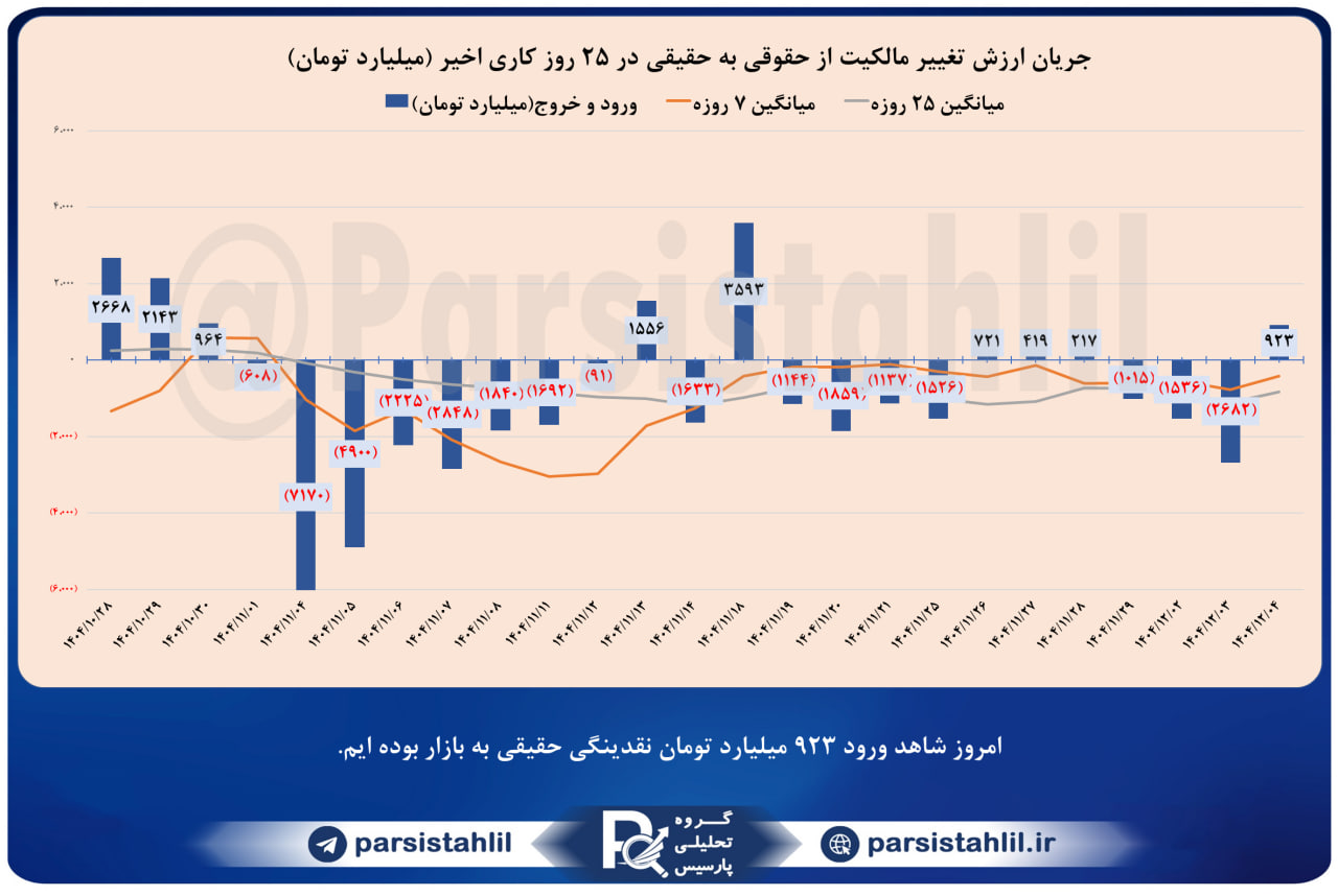 در بازار امروز 1404/12/04 مجموعا مبلغ 923 میلیارد تومان ورود حقیقی به بازار داشته ایم. (سهام + حق تقدم + صندوق های قابل معامله سهامی)