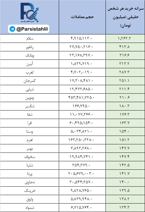 در جدول فوق نمادهایی که بالاترین نسبت سرانه خرید به سرانه فروش مشتریان حقیقی (قدرت خریدار حقیقی) در بازار امروز داشته اند قابل مشاهده است.
