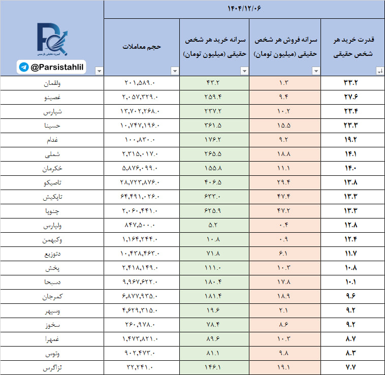در جدول فوق نمادهایی که بالاترین نسبت سرانه خرید به سرانه فروش مشتریان حقیقی (قدرت خریدار حقیقی) در بازار امروز داشته اند قابل مشاهده است.