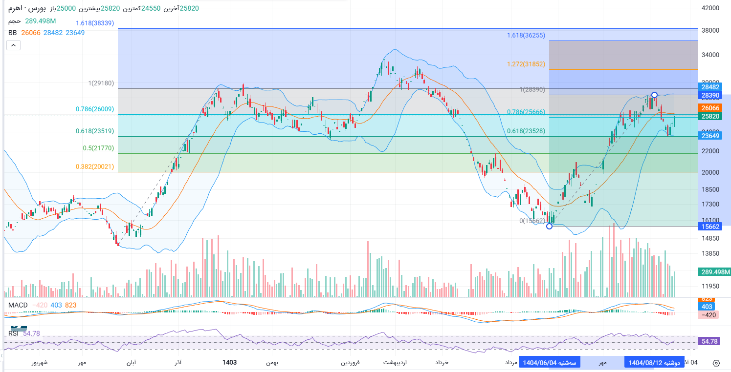 مقاومت‌ها: اولین و مهم‌ترین مقاومت پیش رو، سطح ۰.۷۸۶ فیبوناچی در محدوده ۲۶,۰۰۹ واحد است که با خط میانی باندهای بولینگر (در محدوده ۲۶,۰۶۶ واحد) نیز هم‌پوشانی دارد. عبور قدرتمند از این ناحیه، اولین سیگنال جدی برای پایان اصلاح و آغاز موج صعودی بعدی خواهد بود. مقاومت نهایی نیز سقف تاریخی اخیر در محدوده ۲۸,۹۹۰ واحد است.