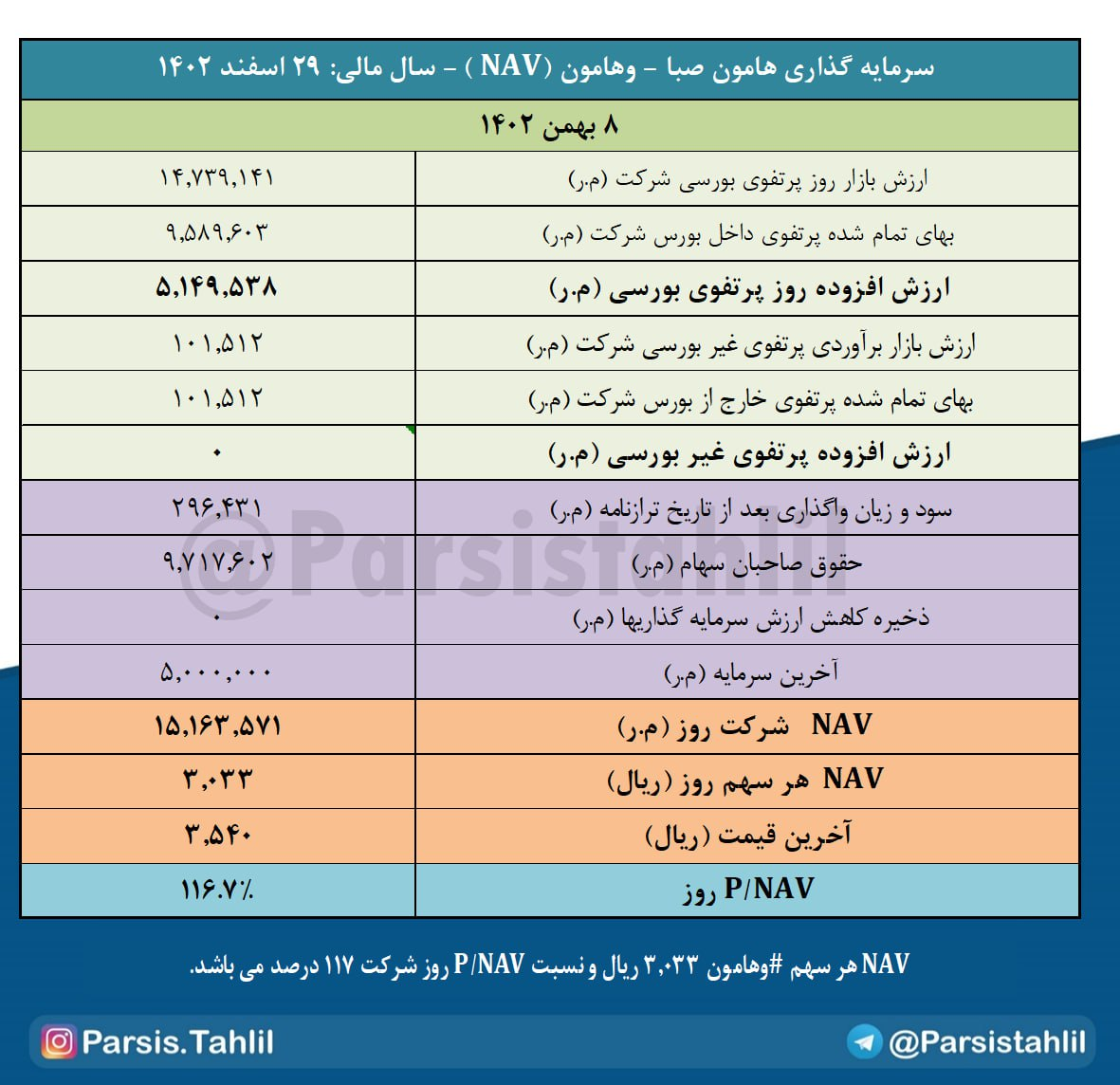 بدین ترتیب NAV هر سهم #وهامون 3,033 ریال و نسبت P/NAV روز شرکت 117 درصد می باشد.