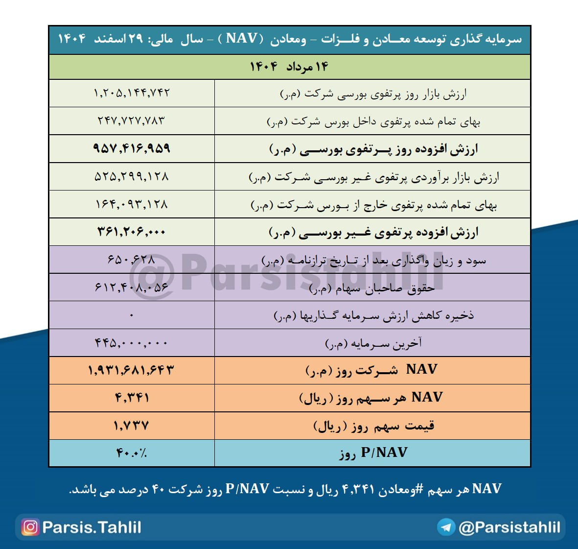بدین ترتیب NAV هر سهم #ومعادن 4,341 ریال و نسبت P/NAV روز شرکت 40 درصد می باشد.