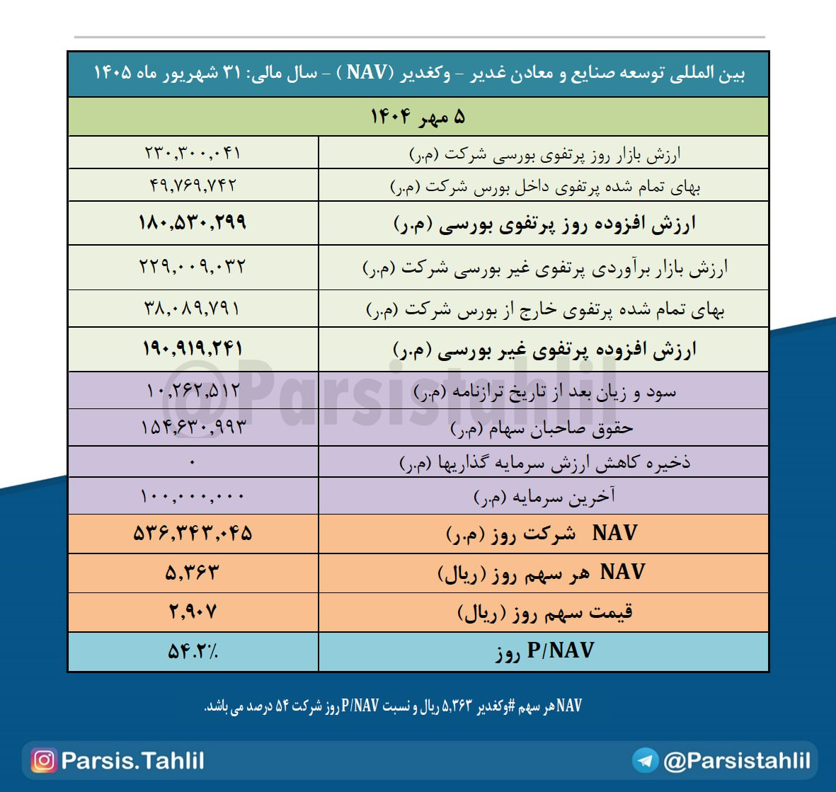 بدین ترتیب NAV هر سهم #وکغدیر 5,363 ریال و نسبت P/NAV روز شرکت 54 درصد می باشد.