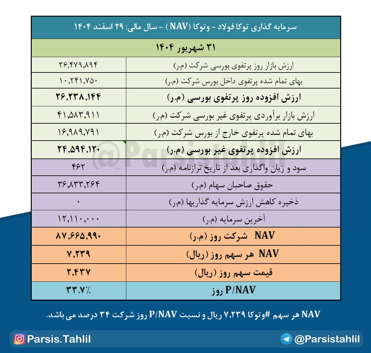 بدین ترتیب NAV هر سهم #وتوکا 7,239 ریال و نسبت P/NAV روز شرکت 34 درصد می باشد.