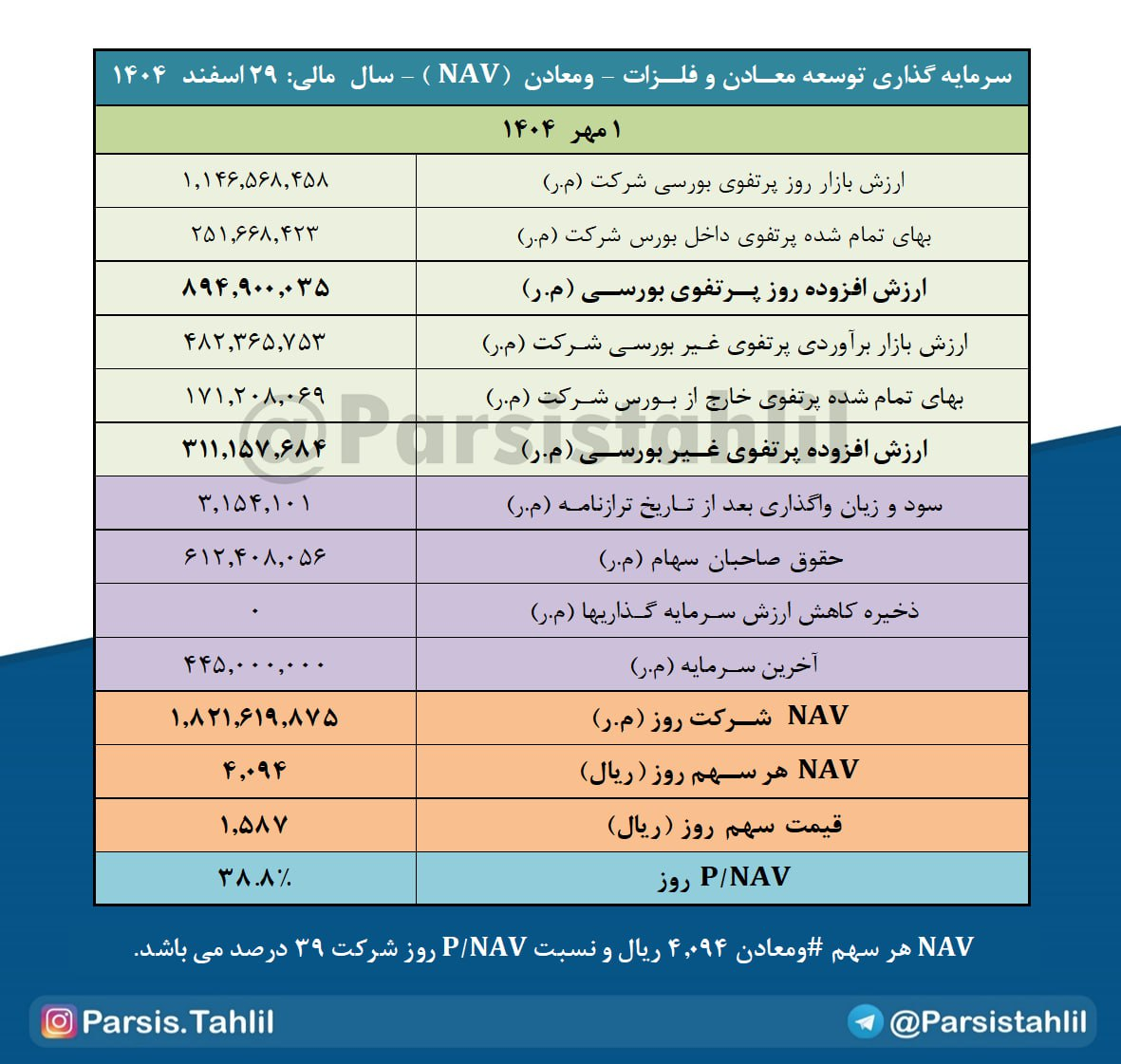 بدین ترتیب NAV هر سهم #ومعادن 4,094 ریال و نسبت P/NAV روز شرکت 39 درصد می باشد.