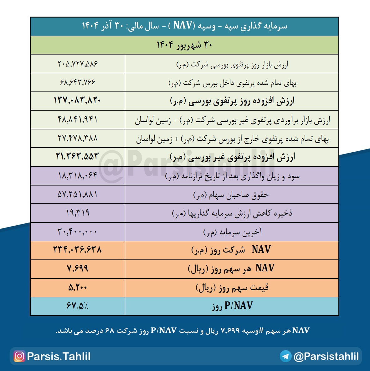 بدین ترتیب NAV هر سهم #وسپه 7,699 ریال و نسبت P/NAV روز شرکت 68 درصد می باشد.