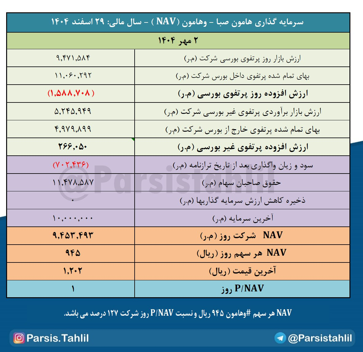 بدین ترتیب NAV هر سهم #وهامون 945 ریال و نسبت P/NAV روز شرکت 127 درصد می باشد.