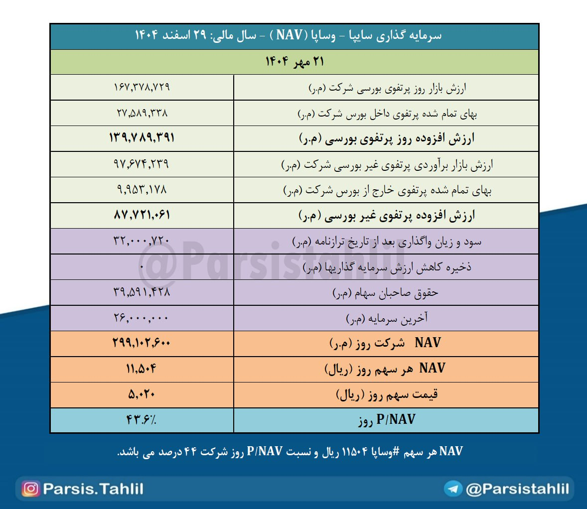 بدین ترتیب NAV هر سهم #وساپا 11504 ریال و نسبت P/NAV روز شرکت 44 درصد می باشد.