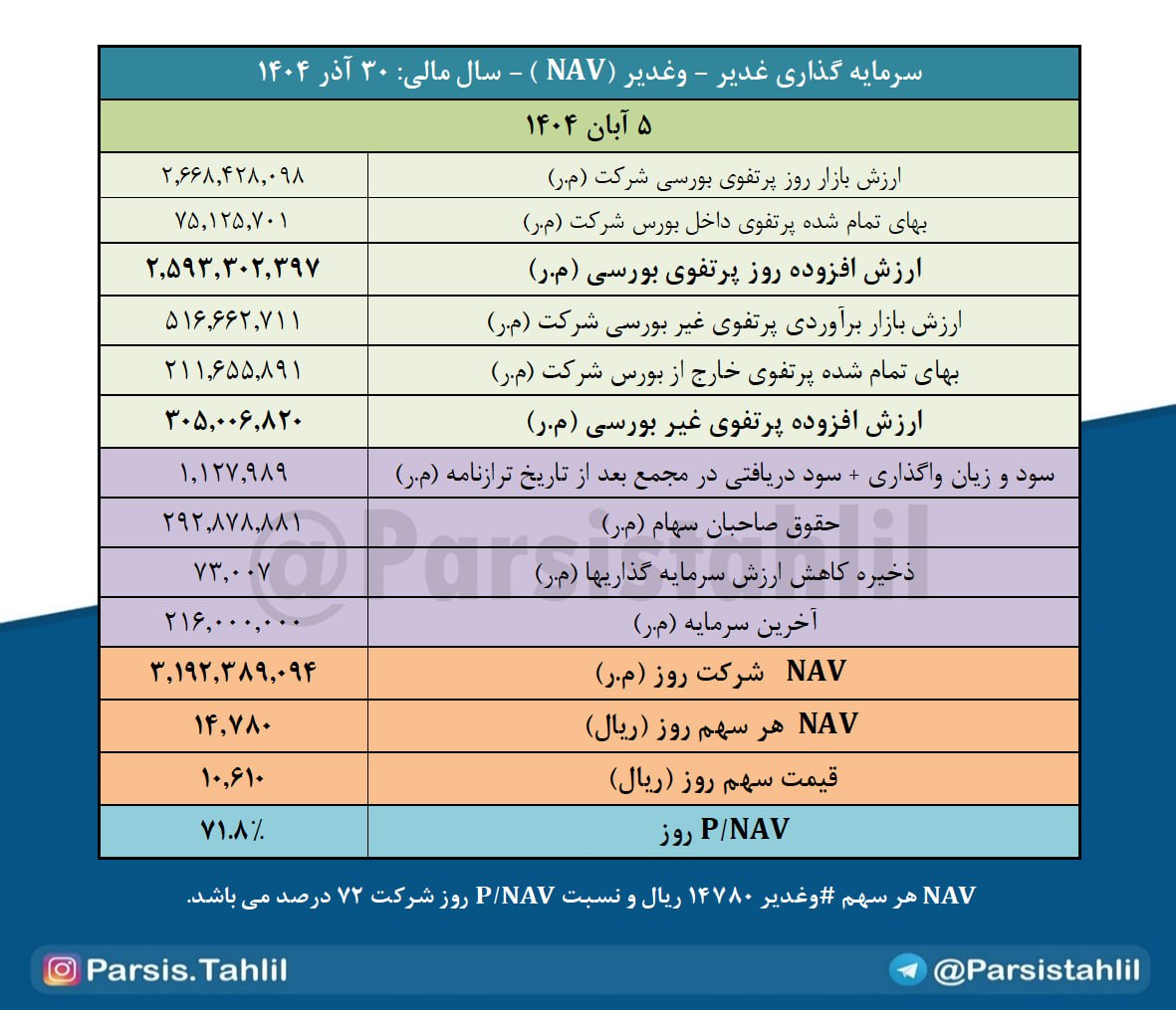 بدین ترتیب NAV هر سهم #وغدیر 14780 ریال و نسبت P/NAV روز شرکت 72 درصد می باشد.