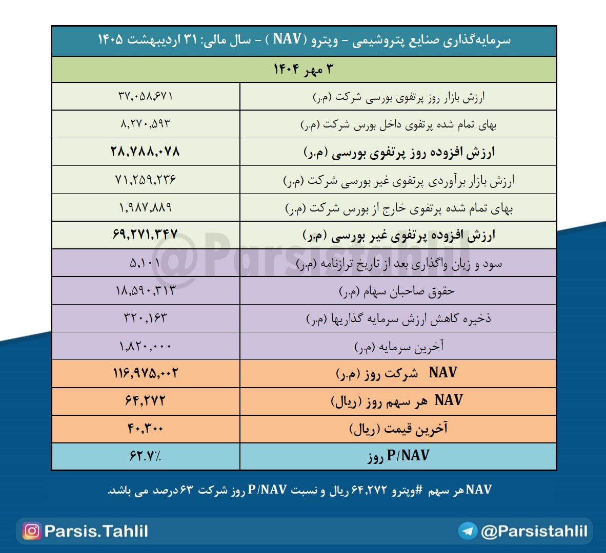 بدین ترتیب NAV هر سهم #وپترو 64,272 ریال و نسبت P/NAV روز شرکت 63 درصد می باشد.
