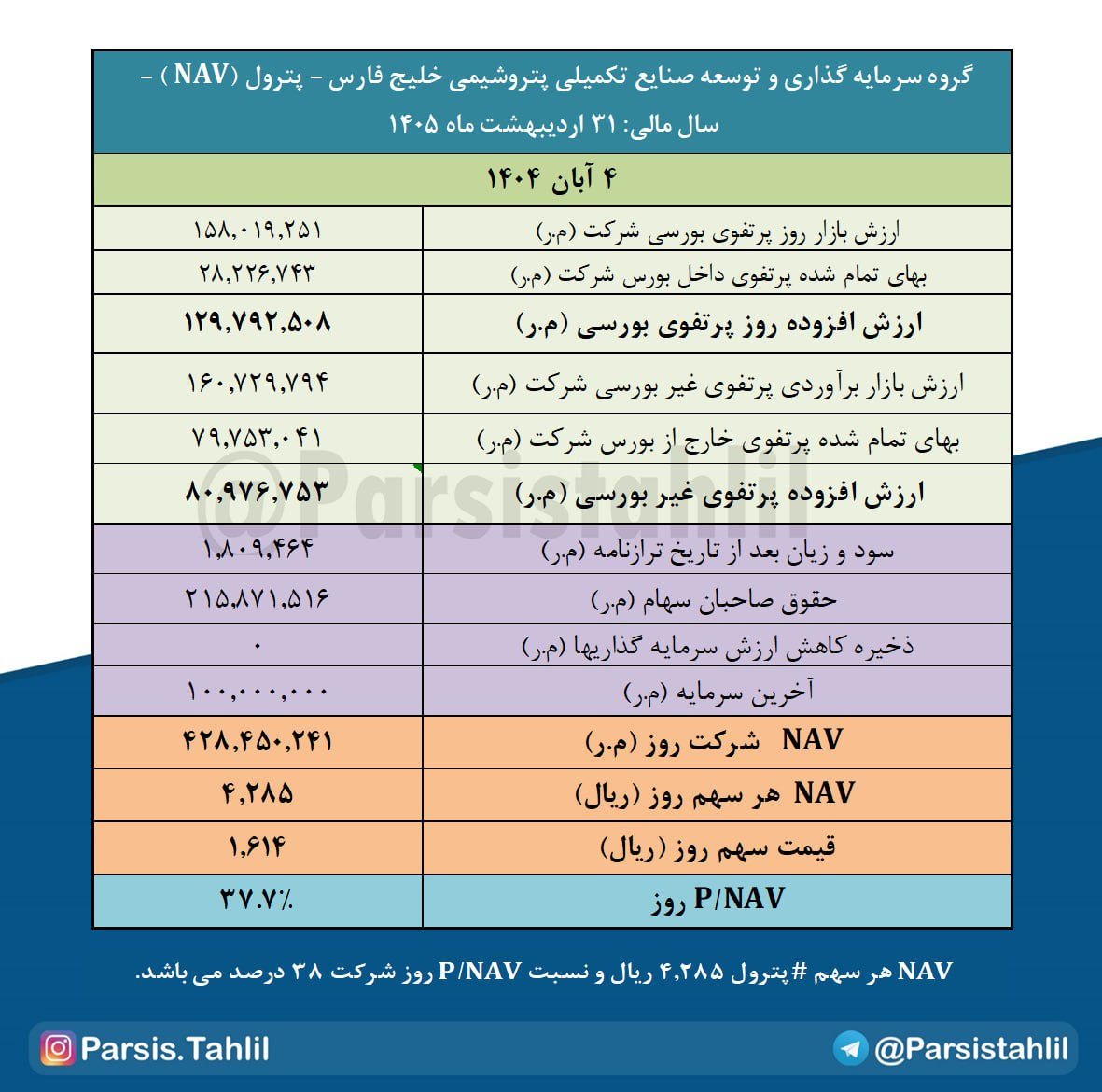 بدین ترتیب NAV هر سهم #پترول 4,285 ریال و نسبت P/NAV روز شرکت 38 درصد می باشد.