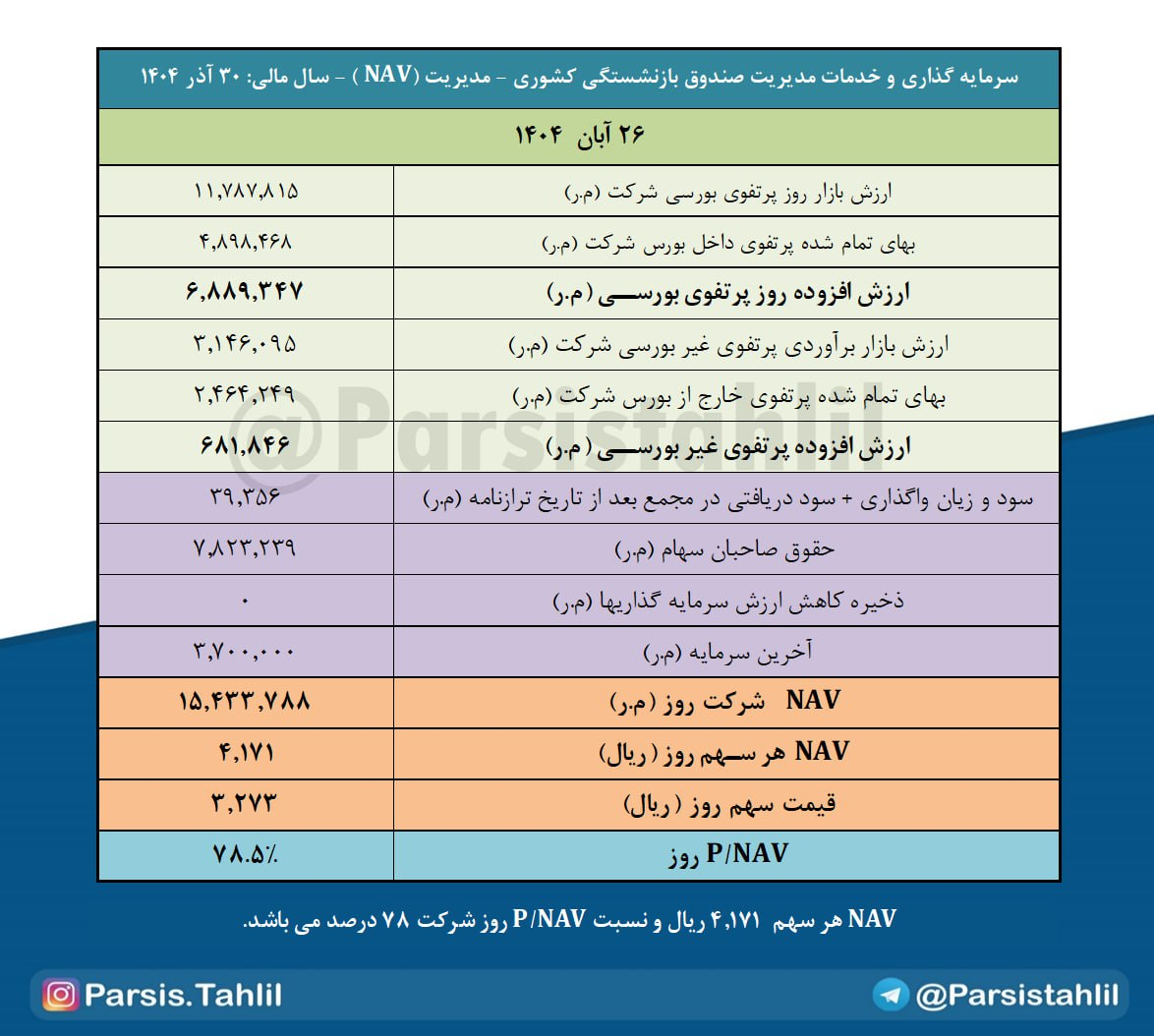 بدین ترتیب NAV هر سهم #مدیریت 4171 ریال و نسبت P/NAV روز شرکت 78 درصد می باشد.