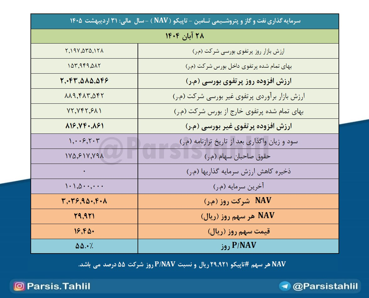 بدین ترتیب NAV هر سهم #تاپیکو 29,921 ریال و نسبت P/NAV روز شرکت 55 درصد می باشد.
