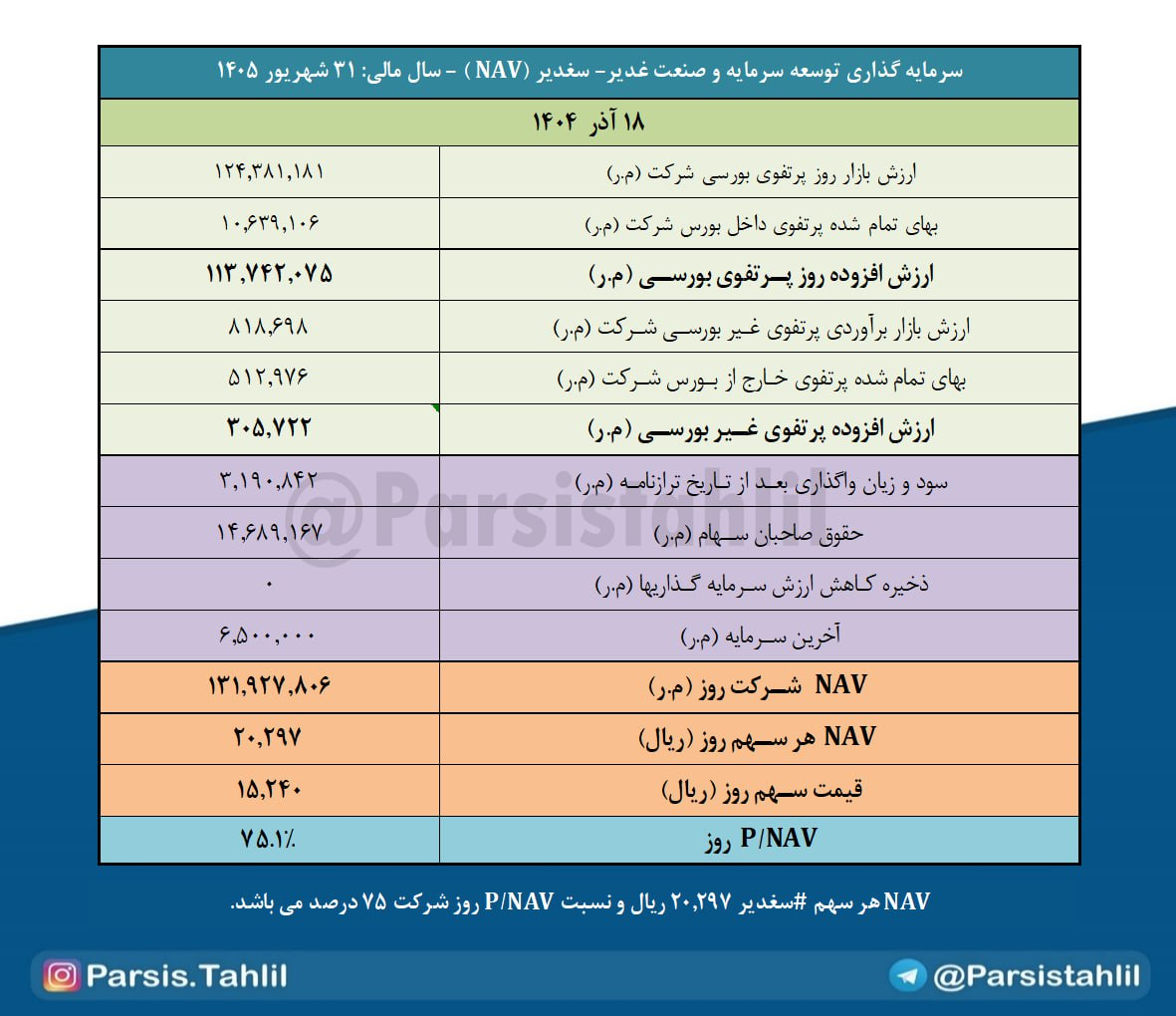 بدین ترتیب NAV هر سهم #سغدیر 20,297 ریال و نسبت P/NAV روز شرکت 75 درصد می باشد.