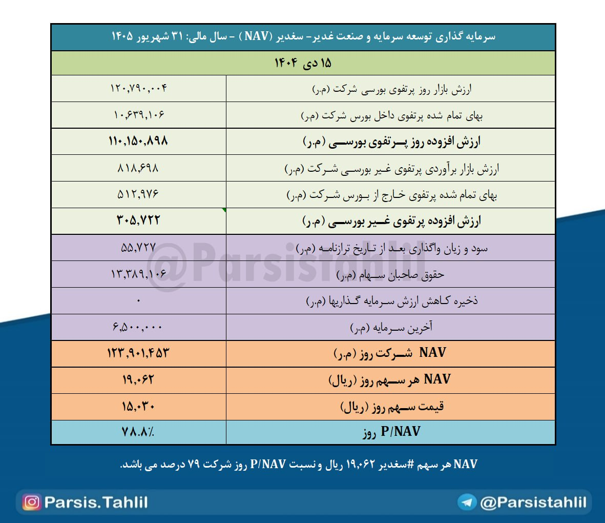 بدین ترتیب NAV هر سهم #سغدیر 19,062 ریال و نسبت P/NAV روز شرکت 79 درصد می باشد.
