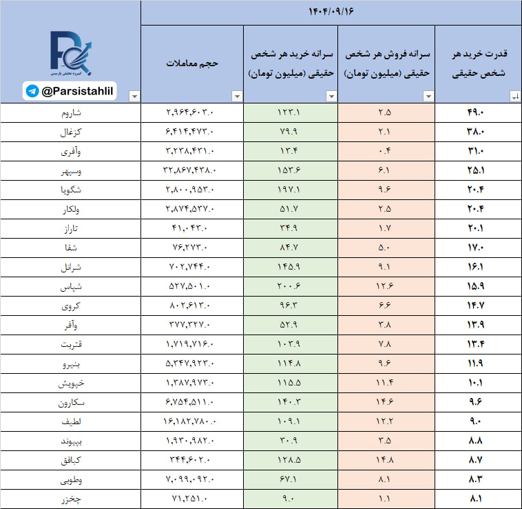 در جدول فوق نمادهایی که بالاترین نسبت سرانه خرید به سرانه فروش مشتریان حقیقی (قدرت خریدار حقیقی) در بازار امروز داشته اند قابل مشاهده است.