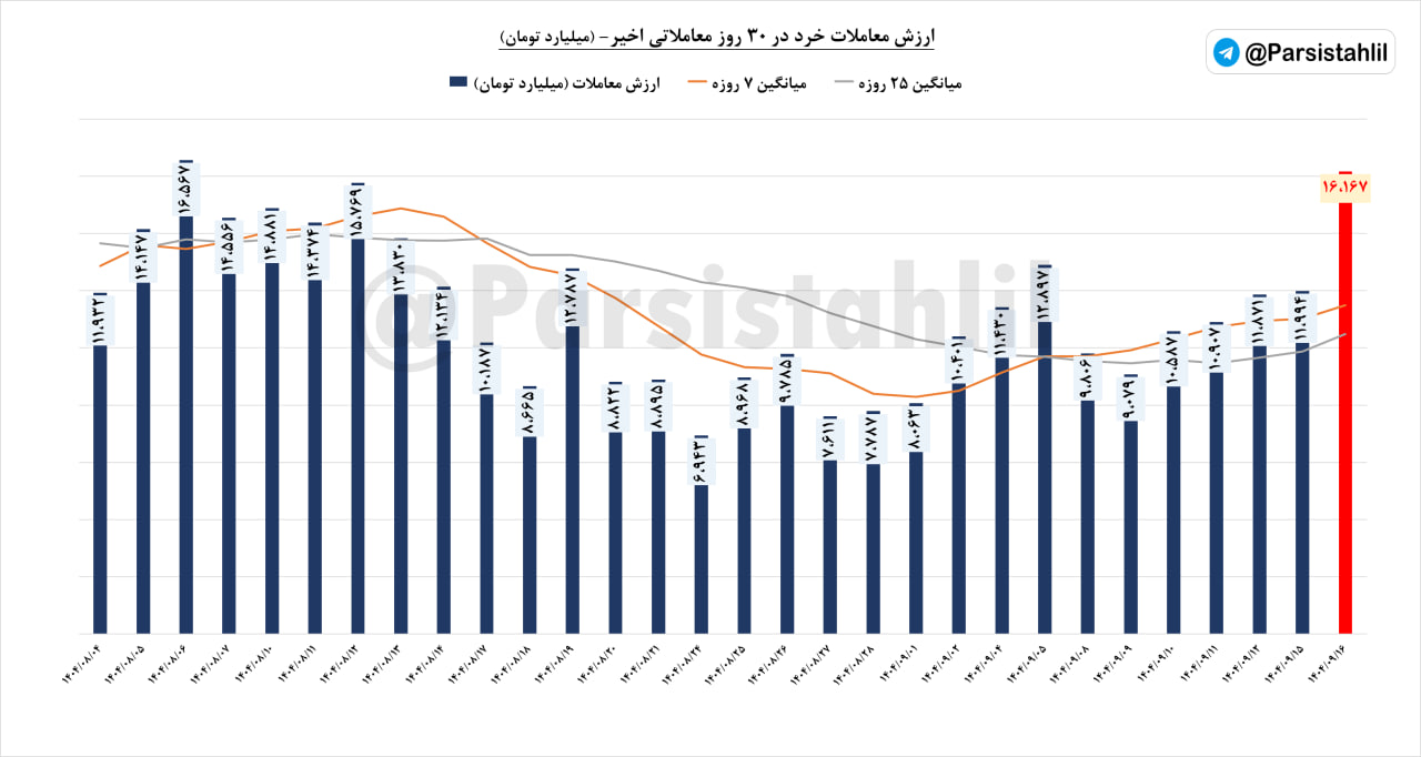 📊ارزش معاملات #خرد (سهام+حق تقدم+صندوق های سهامی) امروز بازار مورخ 16 آذر 1404 مبلغ 16167 میلیارد تومان بود.