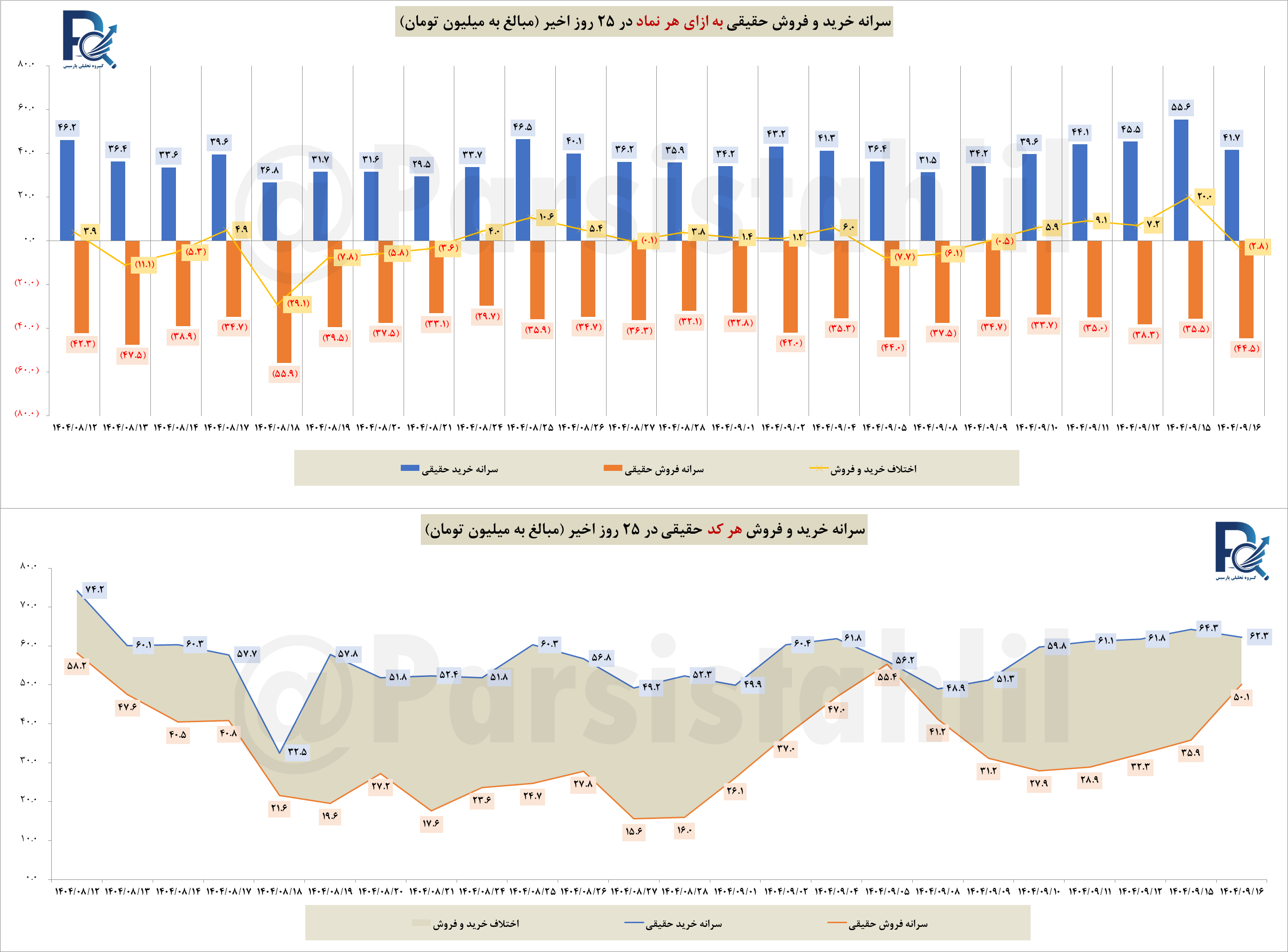 📊دربازار امروز 16 آذر 1404 سرانه خرید هر نماد در بازار ، در حدود 41.7 میلیون تومان و سرانه فروش در حدود 44.5 میلیون تومان بود.