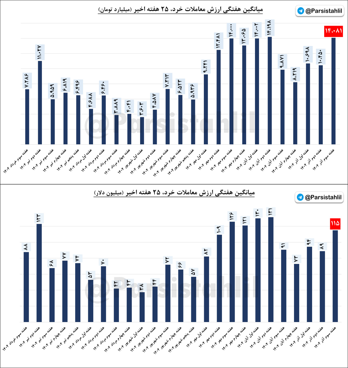 میانگین هفتگی معاملات خرد (ارزش معاملات دلاری) هفته سوم آذر 1404 به 115 میلیون دلار رسید.