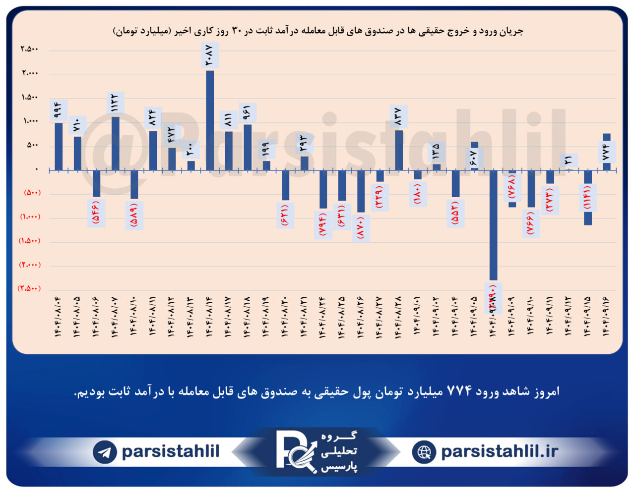 📊 امروز شاهد ورود 774 میلیارد تومان پول حقیقی به صندوق های قابل معامله با درآمد ثابت بودیم.