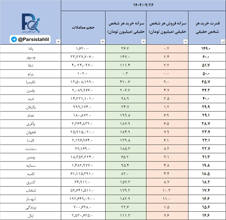 در جدول فوق نمادهایی که بالاترین نسبت سرانه خرید به سرانه فروش مشتریان حقیقی (قدرت خریدار حقیقی) در بازار امروز داشته اند قابل مشاهده است.