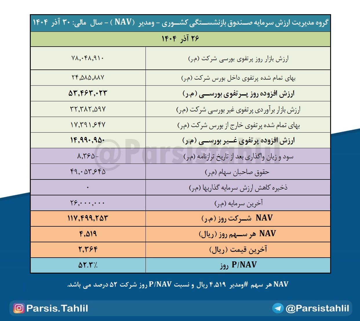 بدین ترتیب NAV هر سهم #ومدیر 4,519 ریال و نسبت P/NAV روز شرکت 52 درصد می باشد.